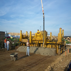 DCC can slipform concrete sidewalks, curb and gutters, streets, parking lots, etc. Shown here slipformming 4' wide sidewalks |
